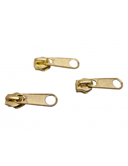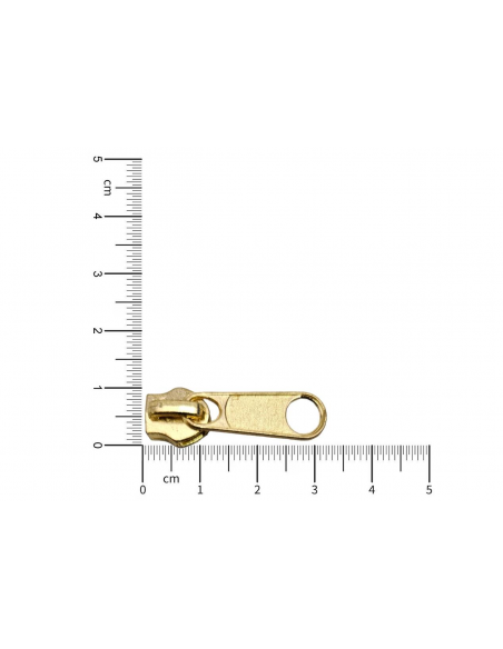 Cursor metálico para cremallera por metros Maya 5 en el color Dorado. Compatible con cremalleras continuas de nylon del mismo número. Es ideal para trabajos de costura, así como para calzado, bolsos y marroquinería, ofreciendo un acabado preciso y duradero.