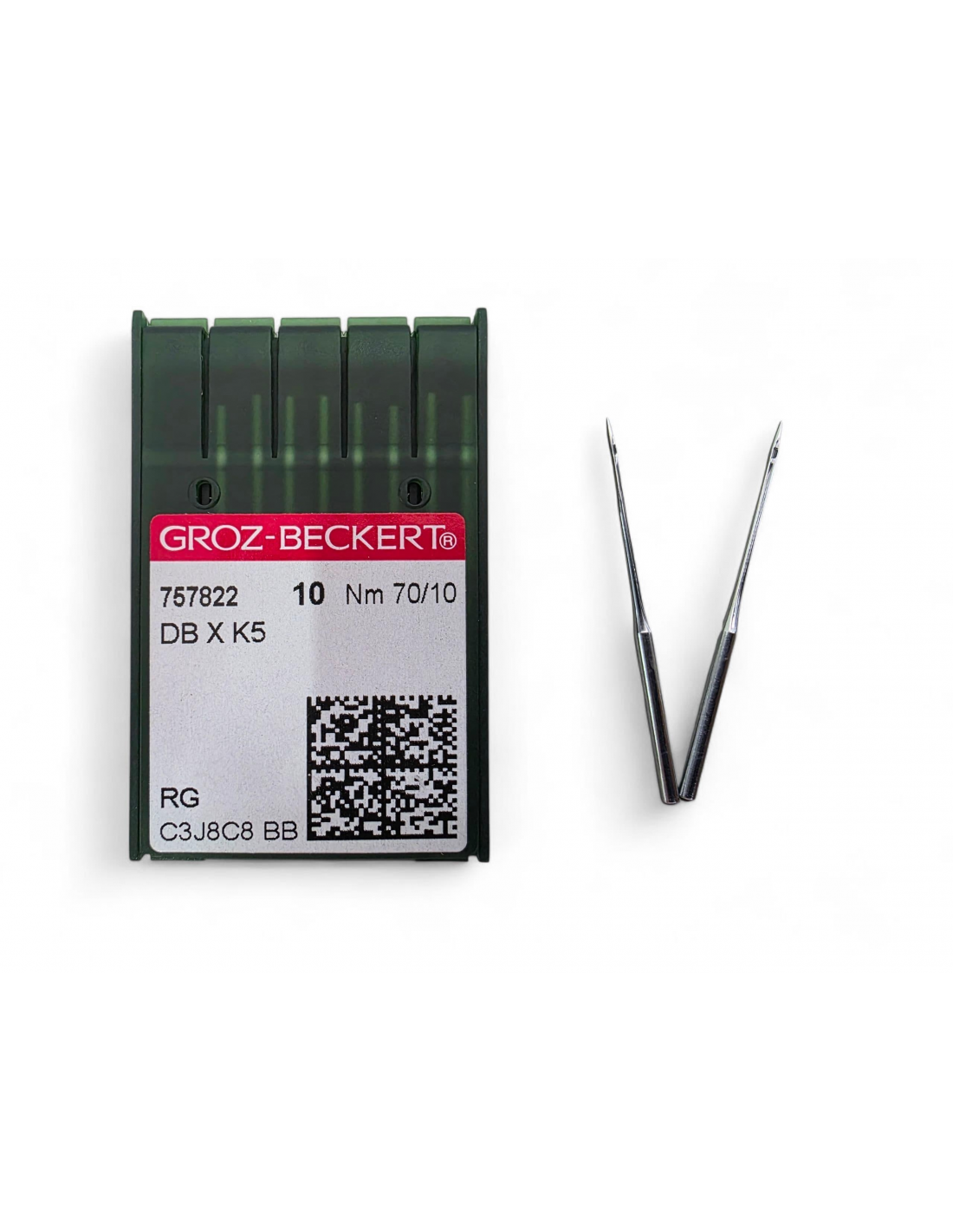 Caja de 10 agujas Groz-Beckert modelo DB X K5 en grosor Nm 70/10, especialmente indicadas para bordado industrial de alta precisión. Este grosor más fino es perfecto para tejidos delicados y bordados detallados, combinando a la perfección con nuestros hilos Isacord 40.