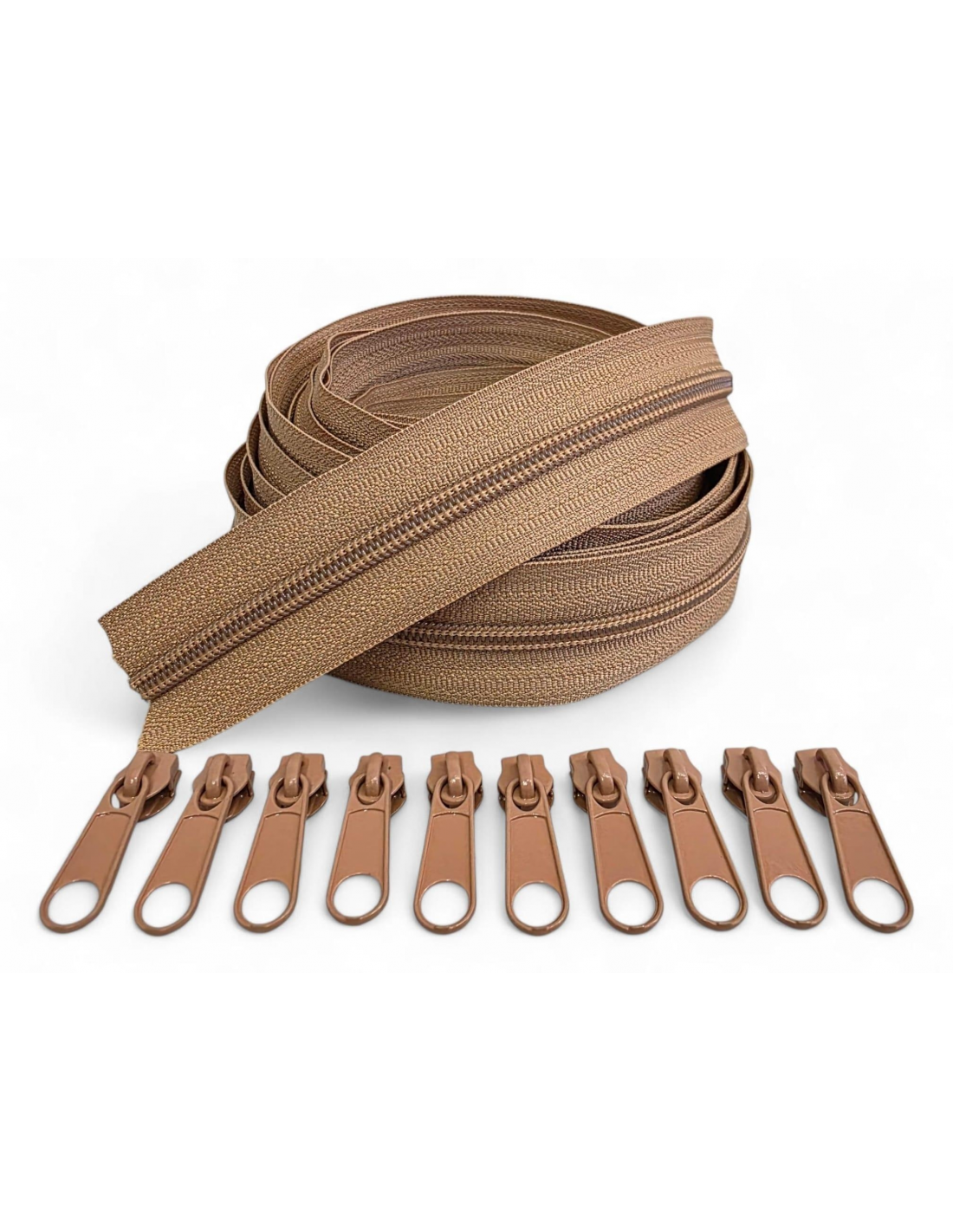 Pack compuesto por 5 metros de cremallera continua Maya 5 R-60633 y 10 cursores Maya 5 R-65715, del mismo tono, listos para montar y utilizar en tus trabajos.