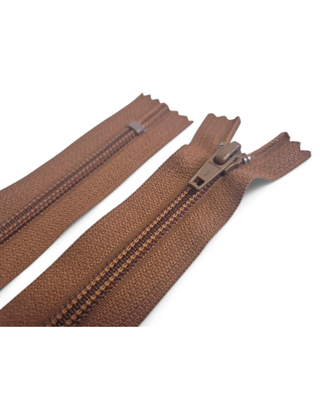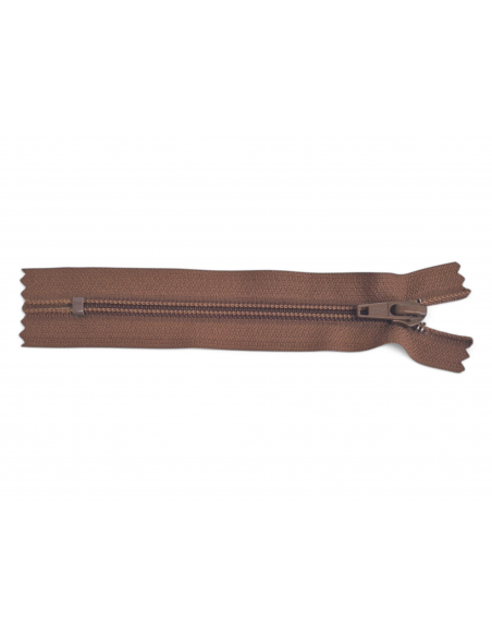 Cremallera YKK cerrada con topes, con maya 5 de nylon cierre en espiral y con cursor metálico al tono de la cinta de poliéster